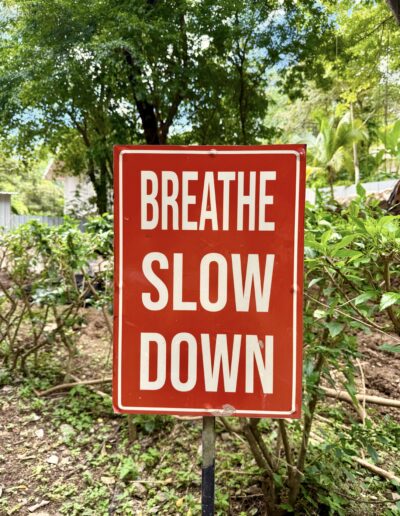 My spirit tingles with excitement, but I can feel my heart protectors squeeze. There’s a different kind of energy fuel here. The rental car salesman doesn’t hustle me for more money. Roadsigns read “Breathe. Slow down.” Hmm.. I’m steadily embracing a genuine presence that makes my heart roar and my protectors squirrely. The land is rich earthy jungle beauty that makes me want to nestle in the comfort of her bosom.